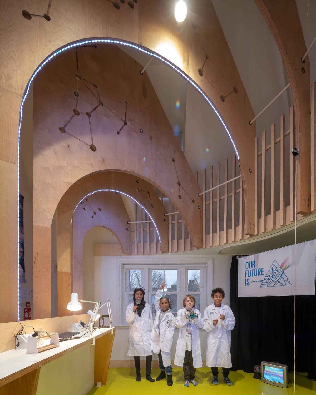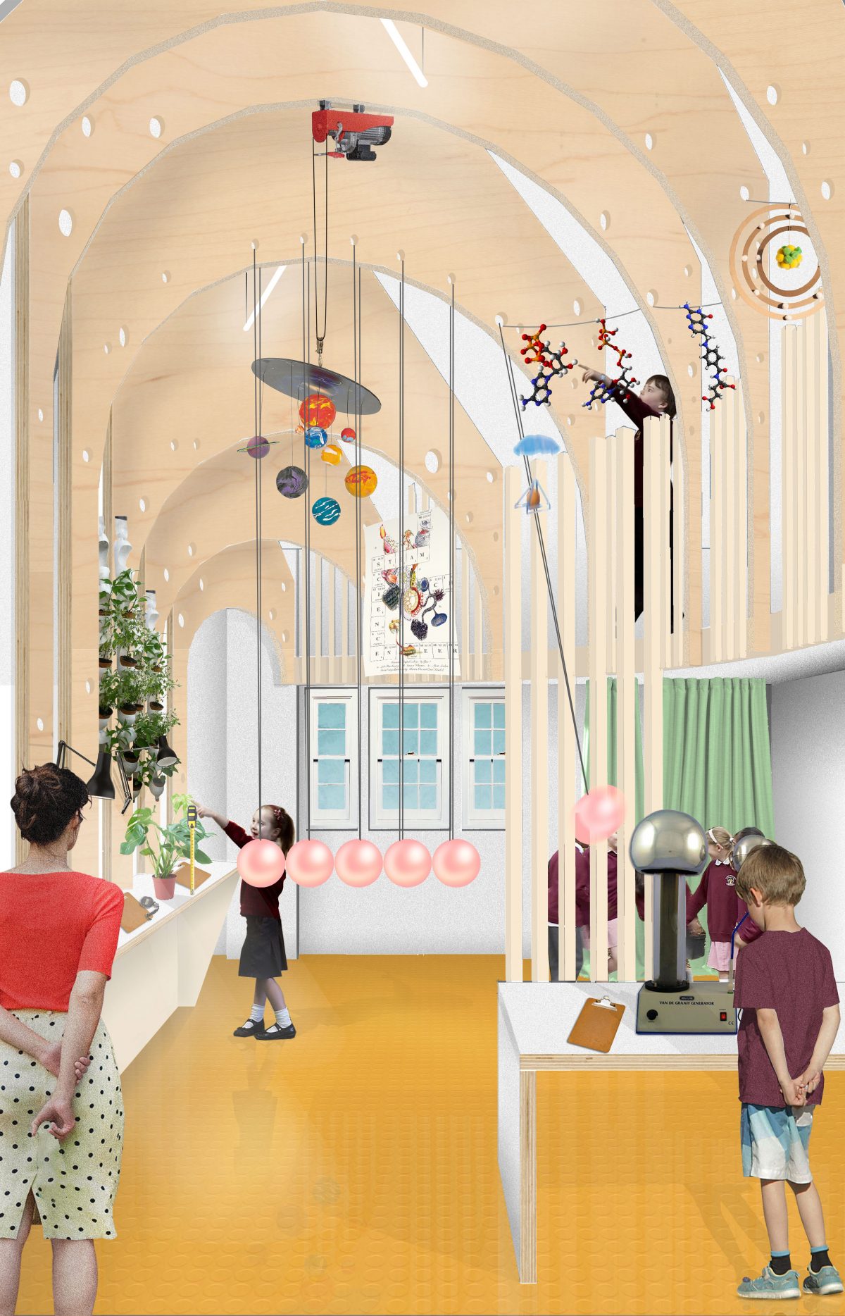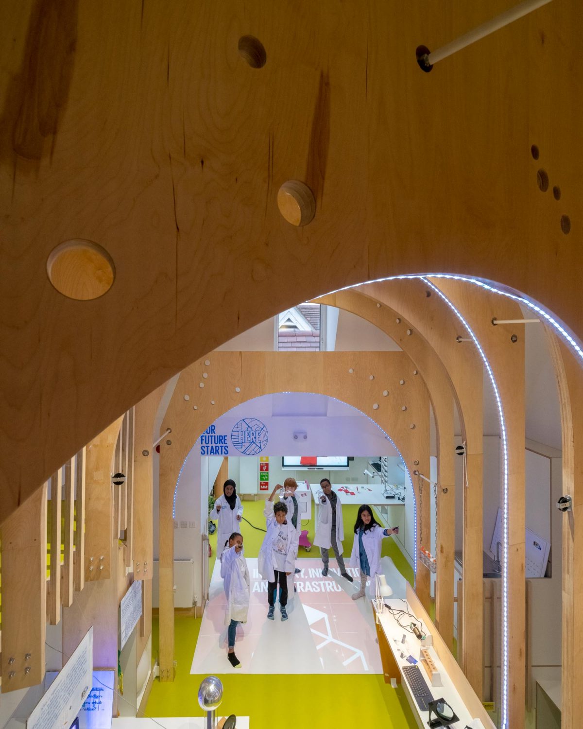 The extension provides a space where primary-school aged children can engage in active and physical experiments and testing of technology-based subjects. The designs were developed through workshops with the school’s pupils and Artist in Residence, Jack Cornell, to explore, test, draw and model the future uses of the space.
