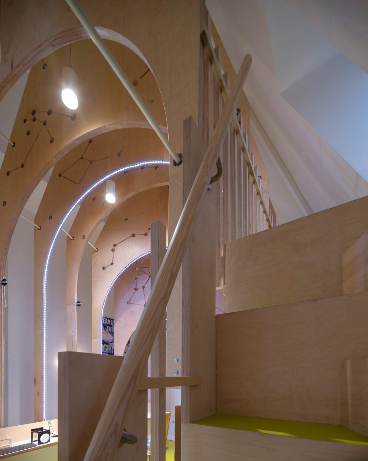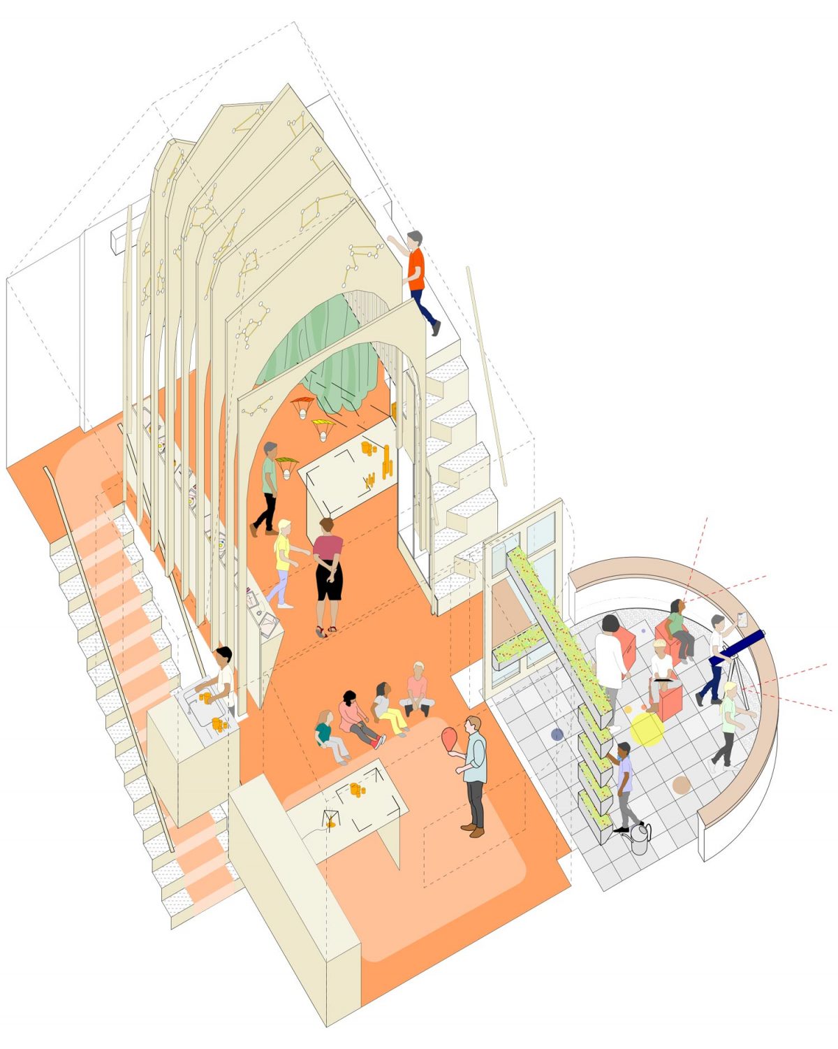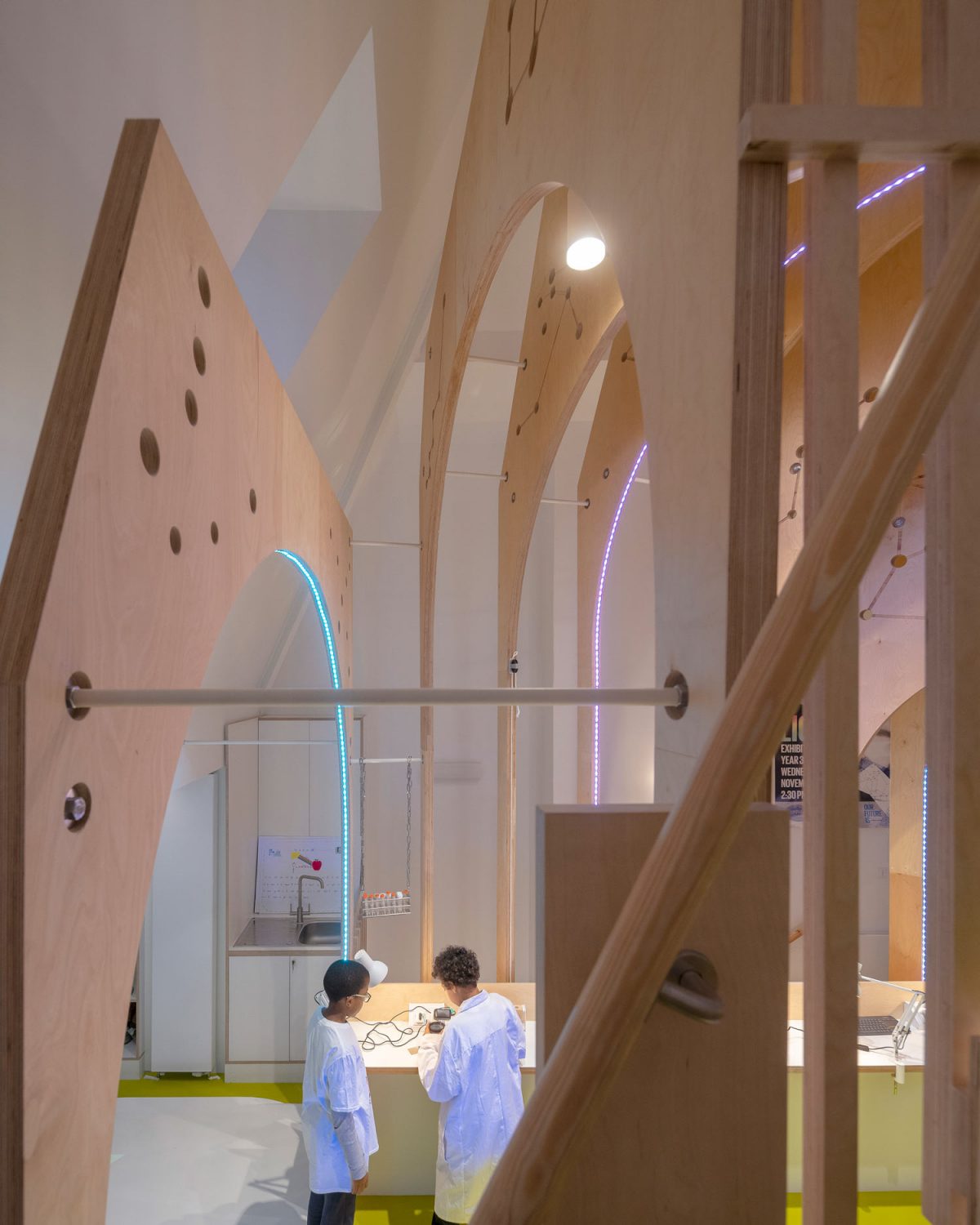 The extension provides a space where primary-school aged children can engage in active and physical experiments and testing of technology-based subjects. The designs were developed through workshops with the school’s pupils and Artist in Residence, Jack Cornell, to explore, test, draw and model the future uses of the space.