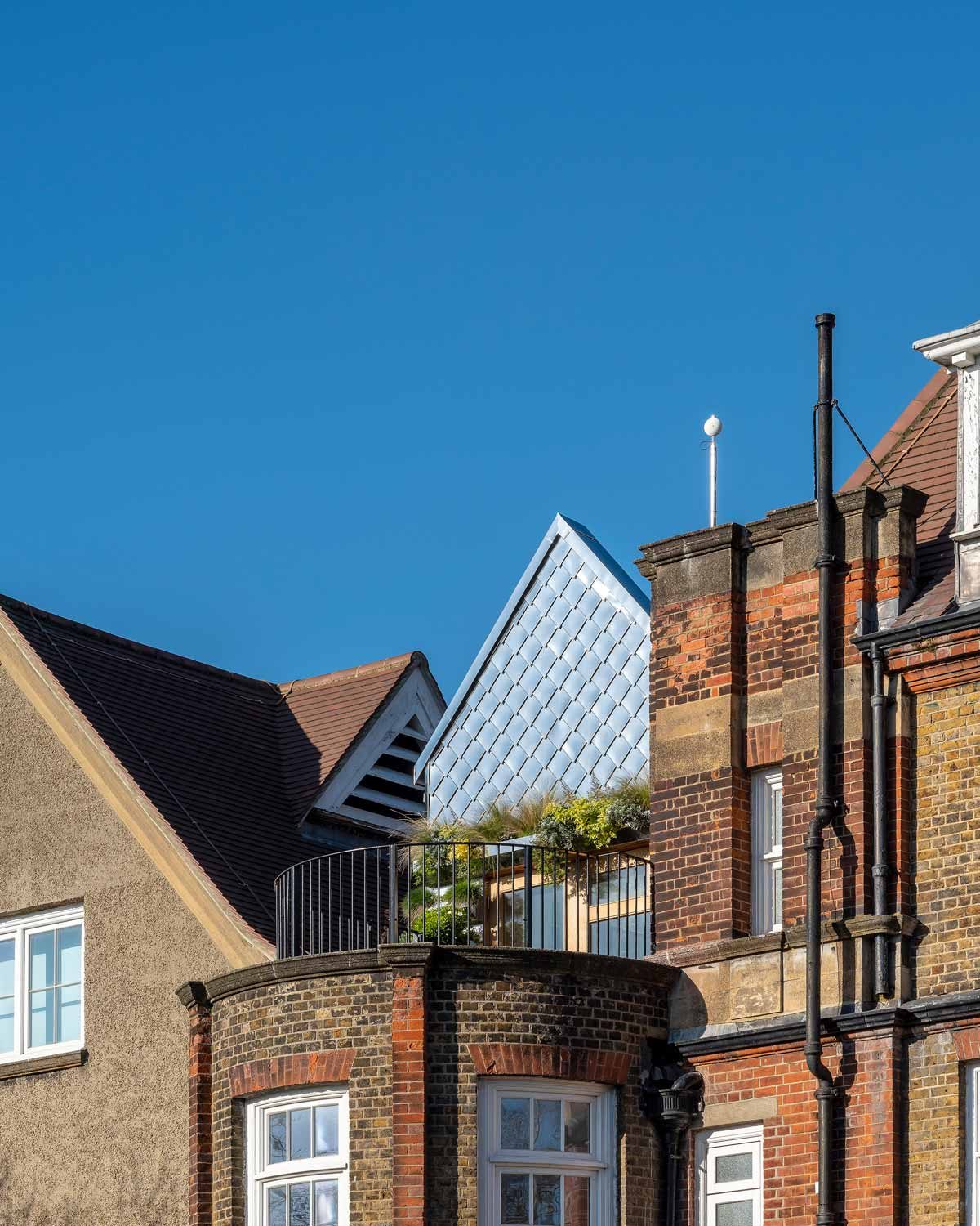 The brief for this STEM (Science, Technology, Engineering and Maths) ‘Activity Lab’ for this school in Kentish Town, north London was to provide a ‘space like no other’. The response was to convert a two-storey ‘turret’ at the top of the school and create a small, shiny and shingled roof-top extension with an external learning terrace.