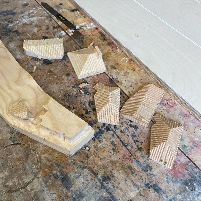 The model is made from Ash and the roofs CNC cut to re-create the rhythm of the slats which will then be lightly brushed with a blowtorch to give the roof a graphic edge like the project itself.