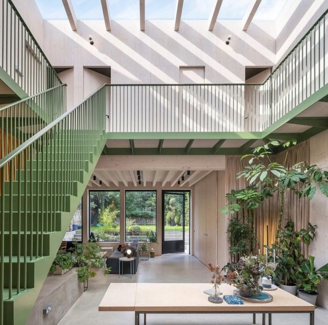 Green House: A new-build home for a photographer centred around an awesome, riad-style courtyard and with a verdant, planted front elevation. The home is constructed from CLT, heated via an ASHP and with a natural stacked ventilation strategy.