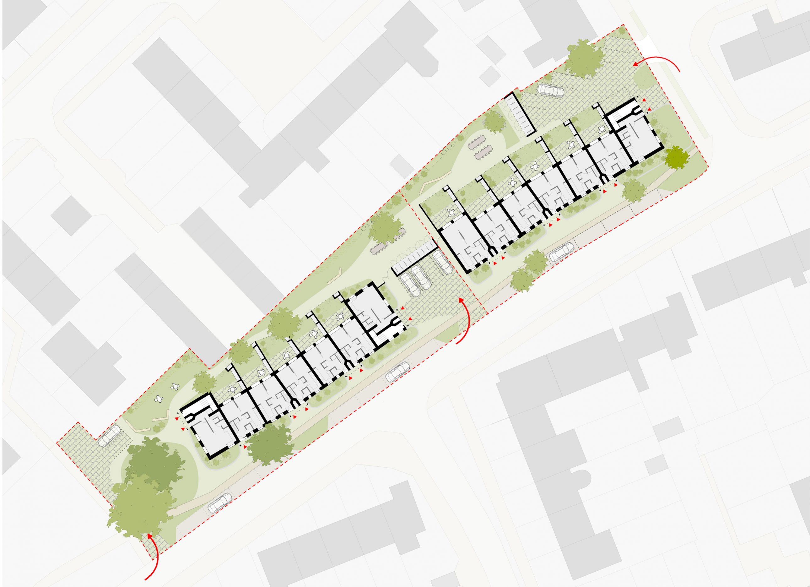 The site sits on a wide, green pedestrian parkway that runs from east to west – connecting Thomas Bennett Community College to the west to Loppett’s Field Playing Fields to the east. The majority of the housing around Tilgate is arranged as two-storey houses with pitched roofs with front and rear gardens.