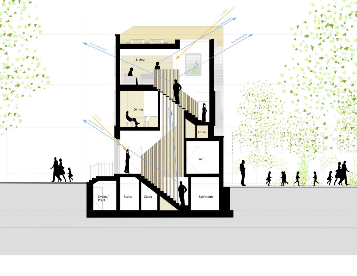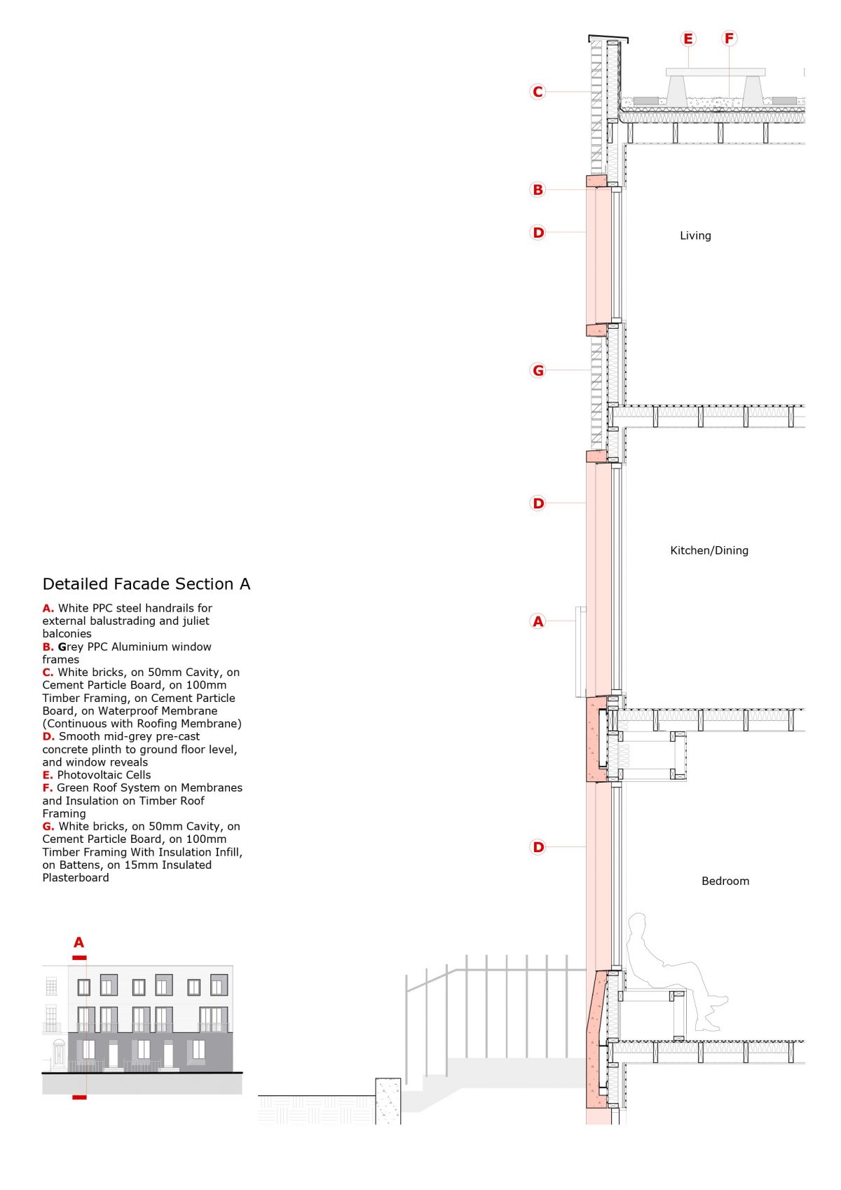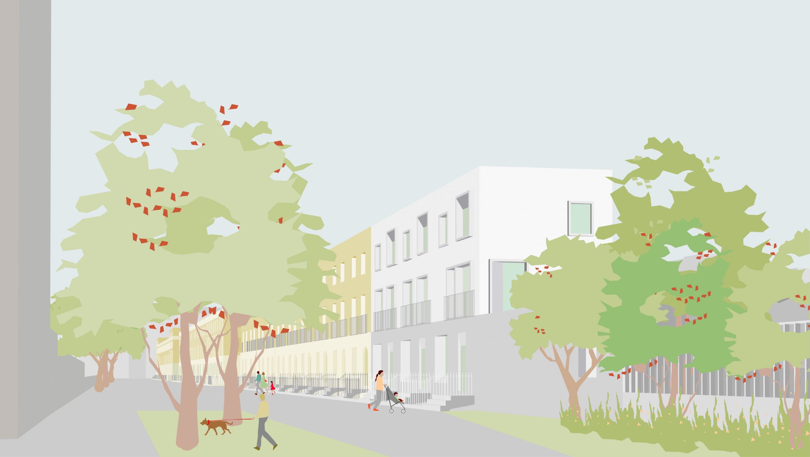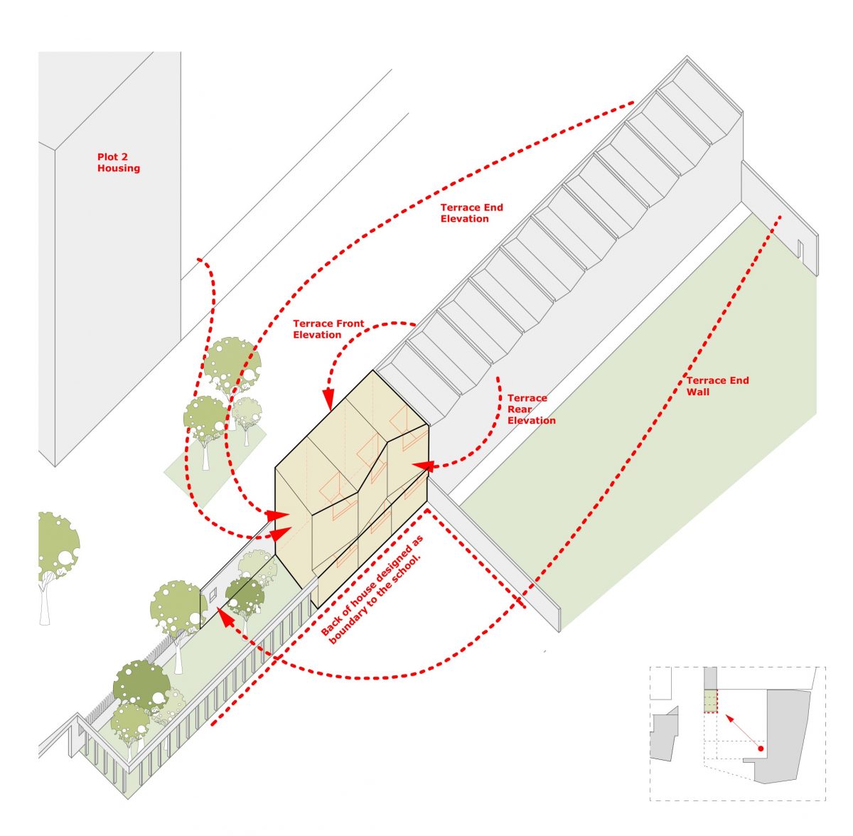 Located on the same footprint as houses demolished in the early 1970s to make way for a new school, the design provides new family-sized homes whilst responding to the role of completing the listed terrace.