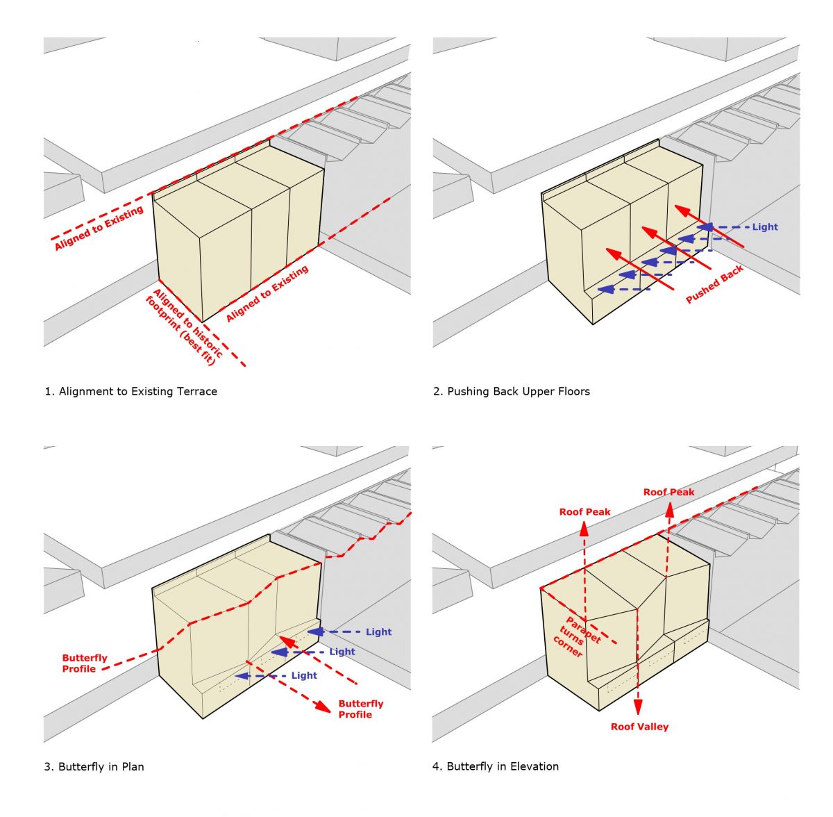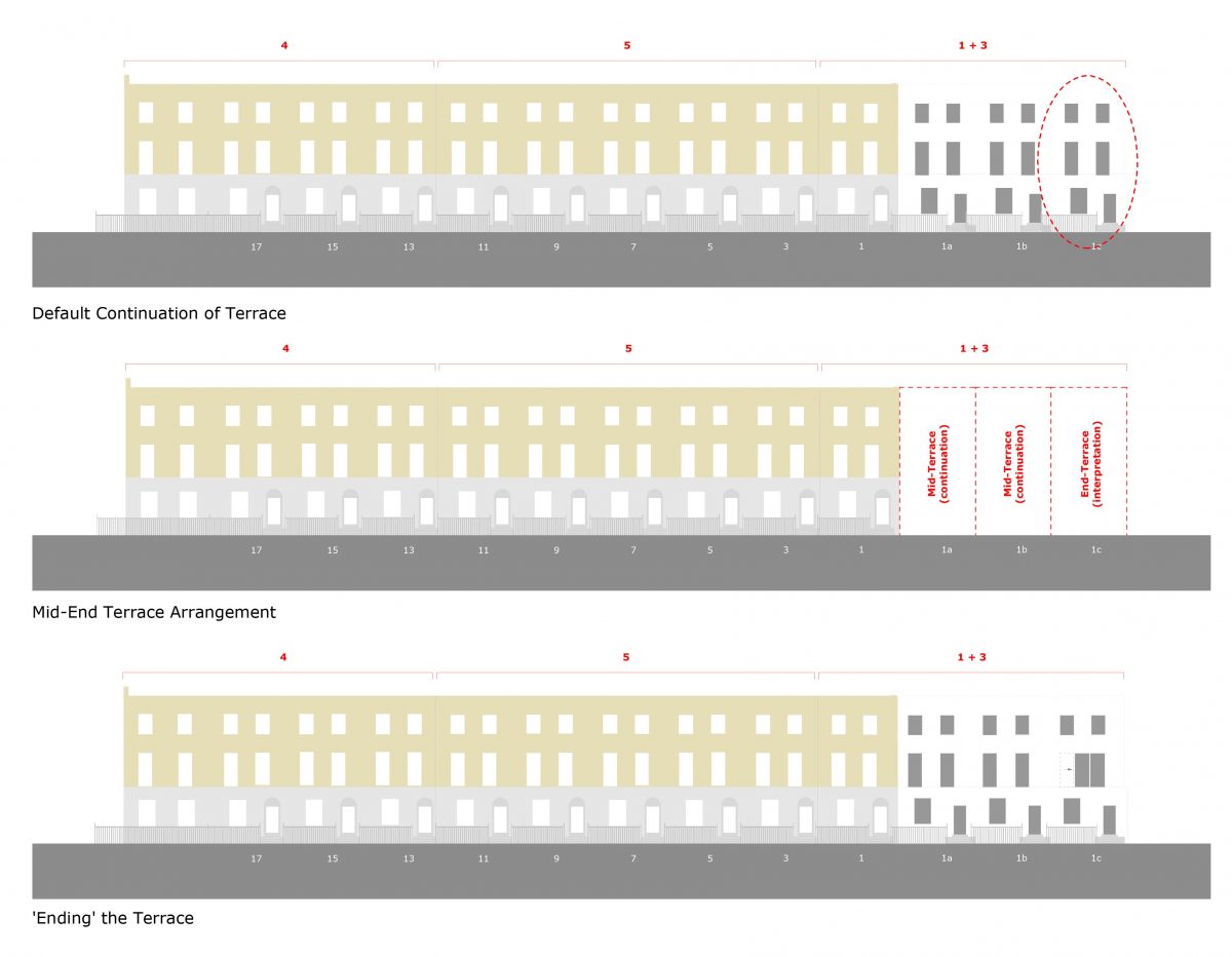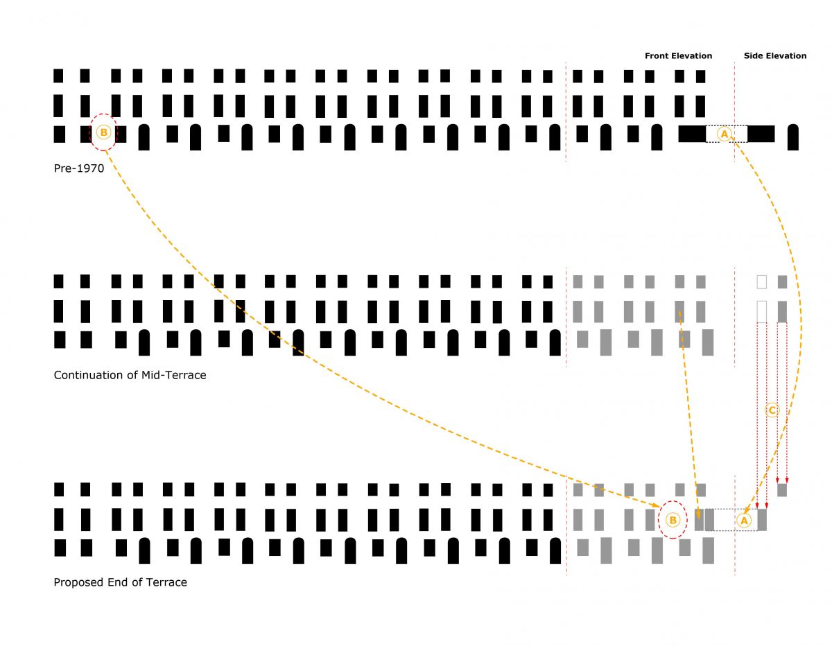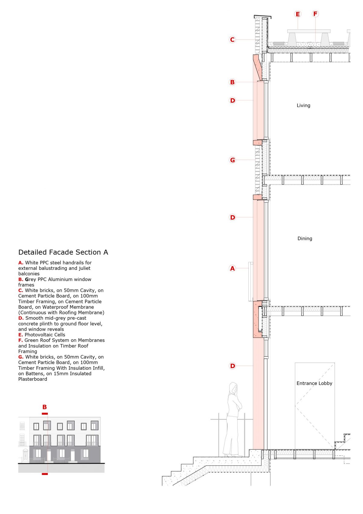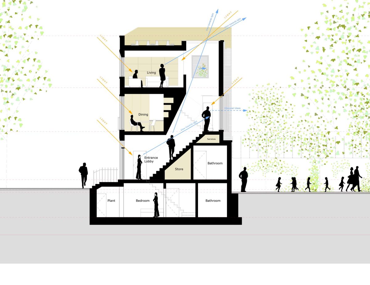 Located on the same footprint as houses demolished in the early 1970s to make way for a new school, the design provides new family-sized homes whilst responding to the role of completing the listed terrace.