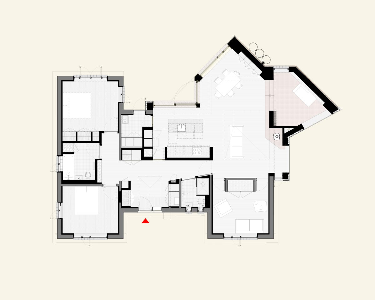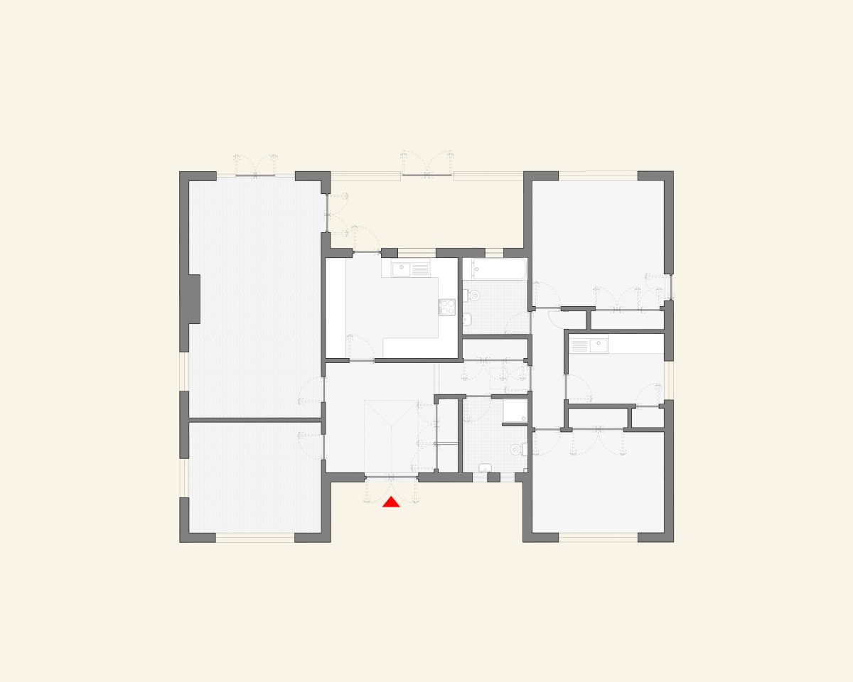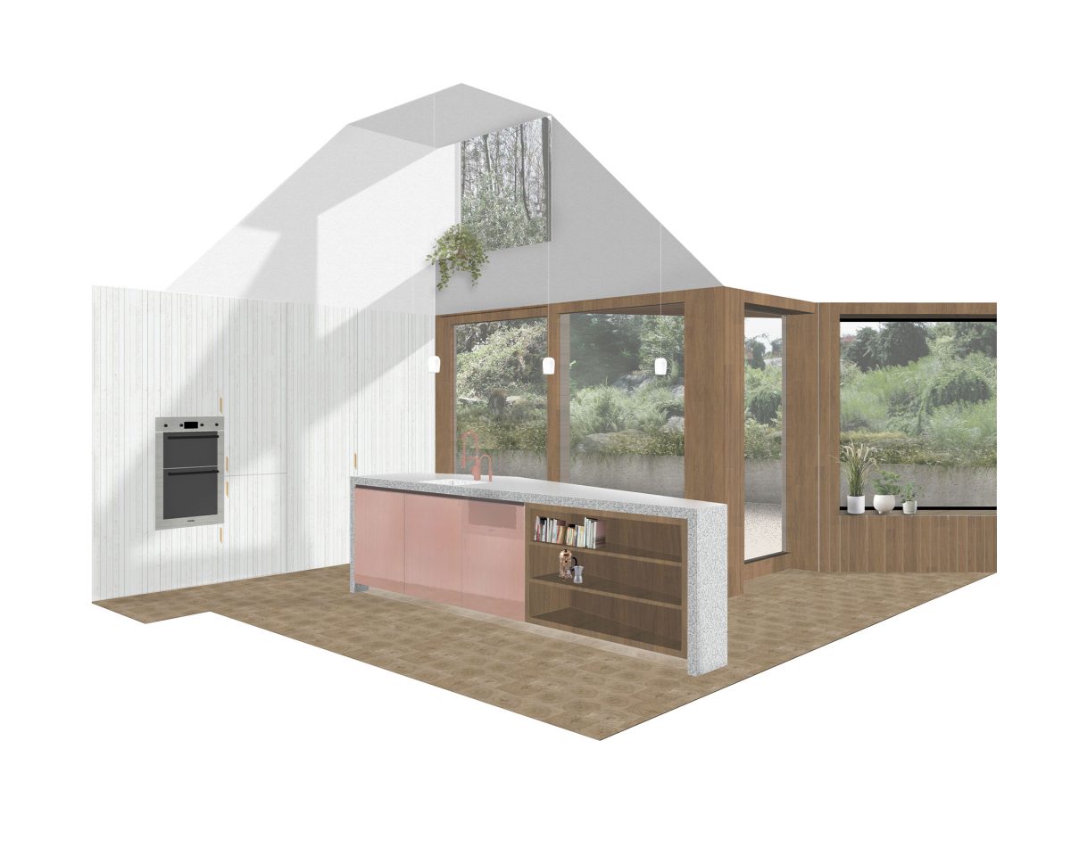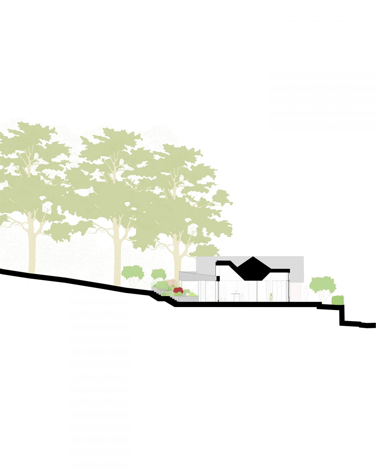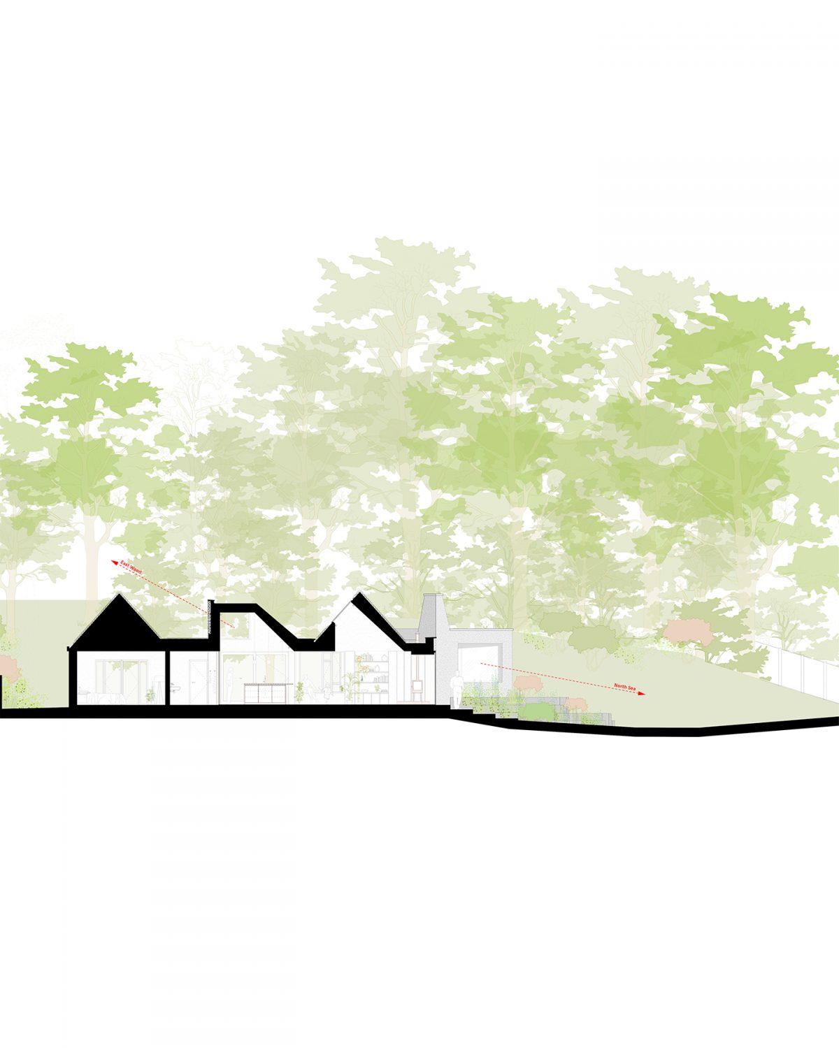 Originally part of the garden of the neighbouring house, the 1980s, H-plan, pattern-book bungalow sat on a flat piece of land where the tennis court to the neighbouring house was once located: the only flat piece of land on a site that has a 7m difference from top to bottom and at a fall of up to 1 in 6.