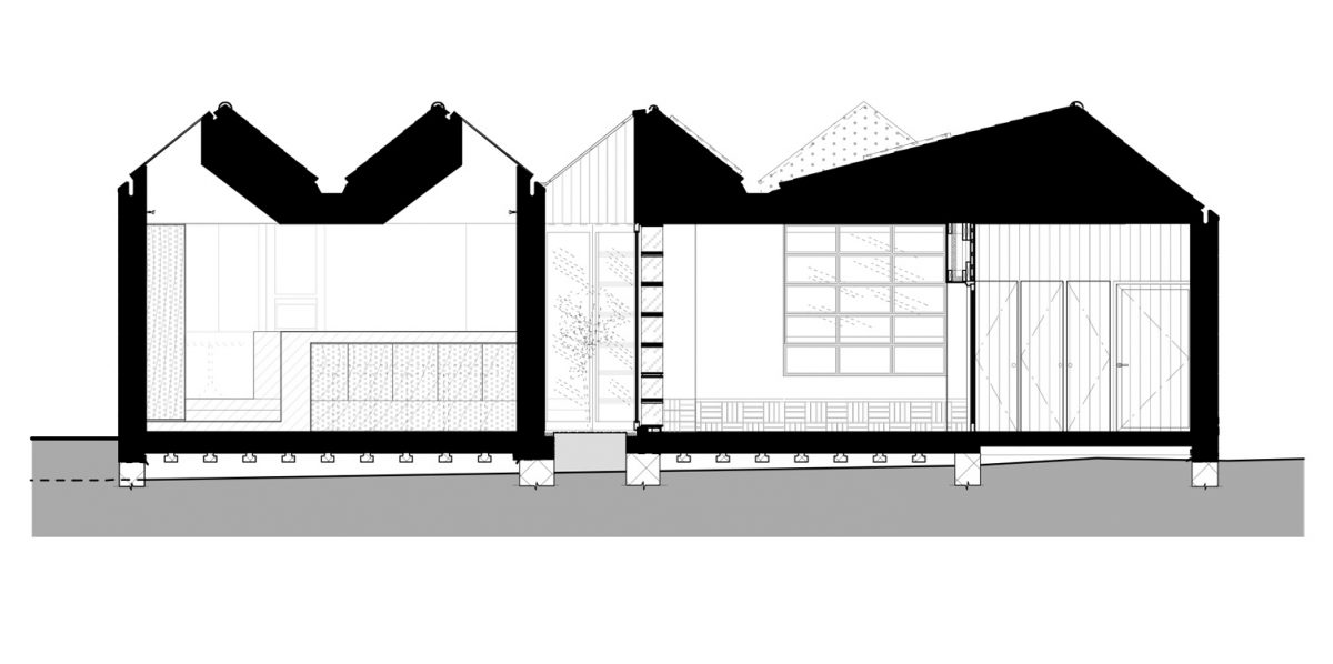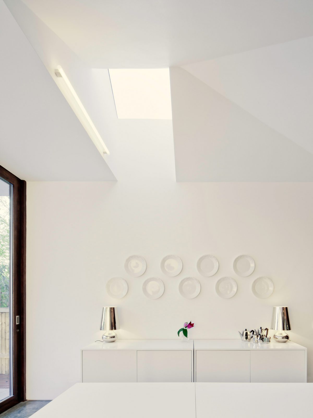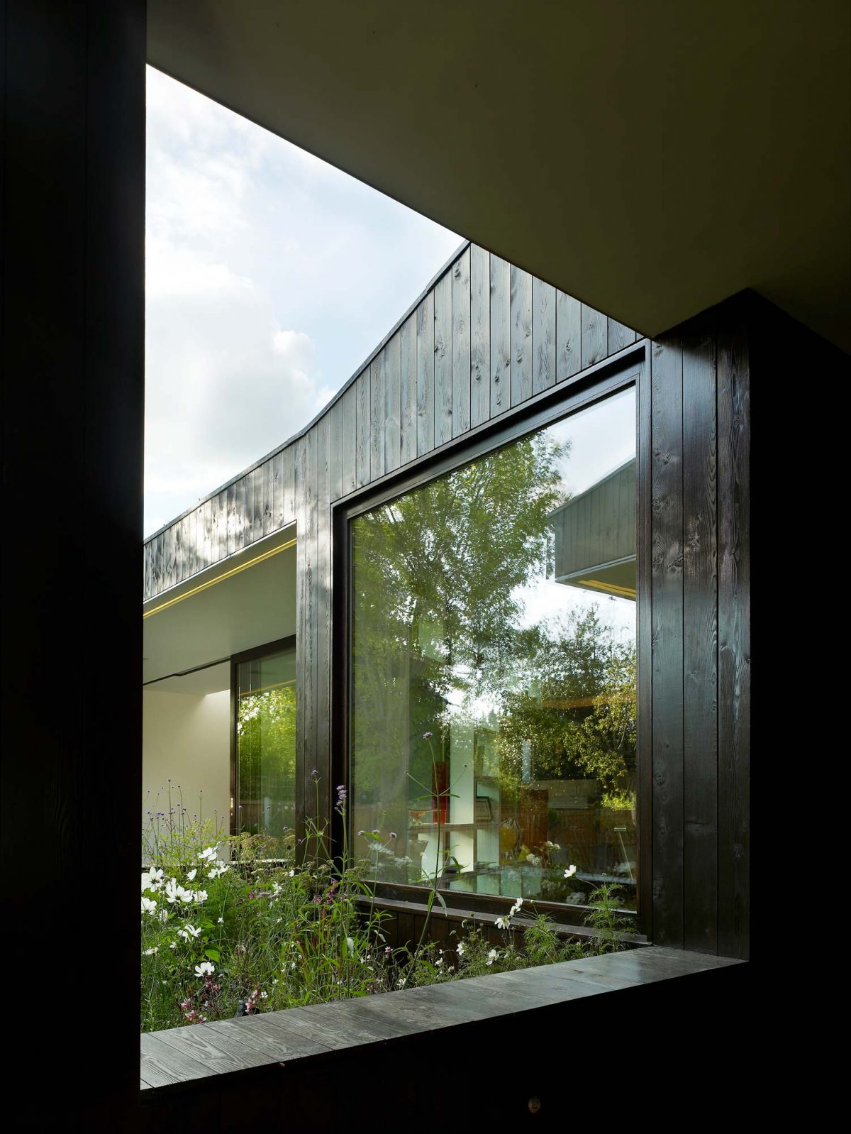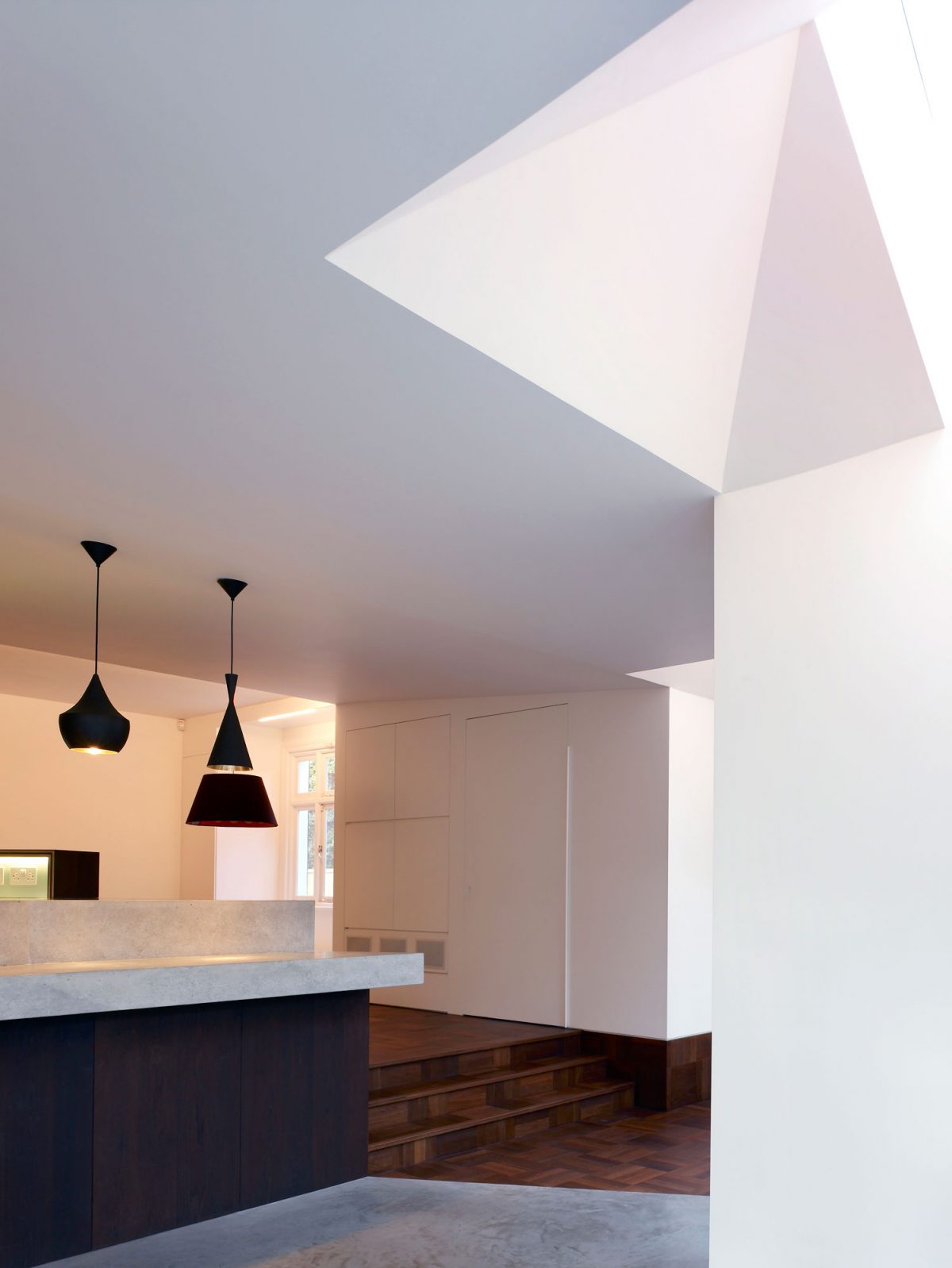 The design opens up and extends the rear of the house to provide differing levels of physical and visual permeability, openness and intimacy. Formally, the design mimics and reinterprets the pitched roof of the original building creating a unique form that belies the extension’s scale. Projecting canopies, cantilevered eaves and a staggered plan, enclose spaces that embrace the programmes and patterns of modern family life.