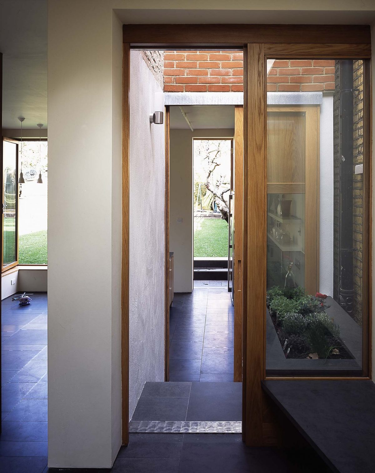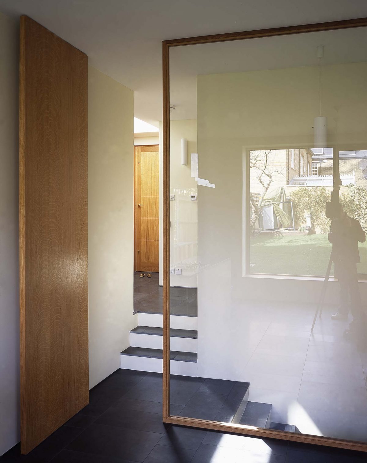 The new entrance was lowered and re-located to the side of the house and a new ‘utility strip’ was created housing coat storage, a herb patch and kitchen units. The new rear extension was formed three steps down to connect the entrance and basement levels and in order to provide a full ‘Victorian’ 2.9m floor-ceiling height. A thick step, with folding-sliding doors, to the garden serves as a bench for the dining room and a perch for children to play on a summer’s day.