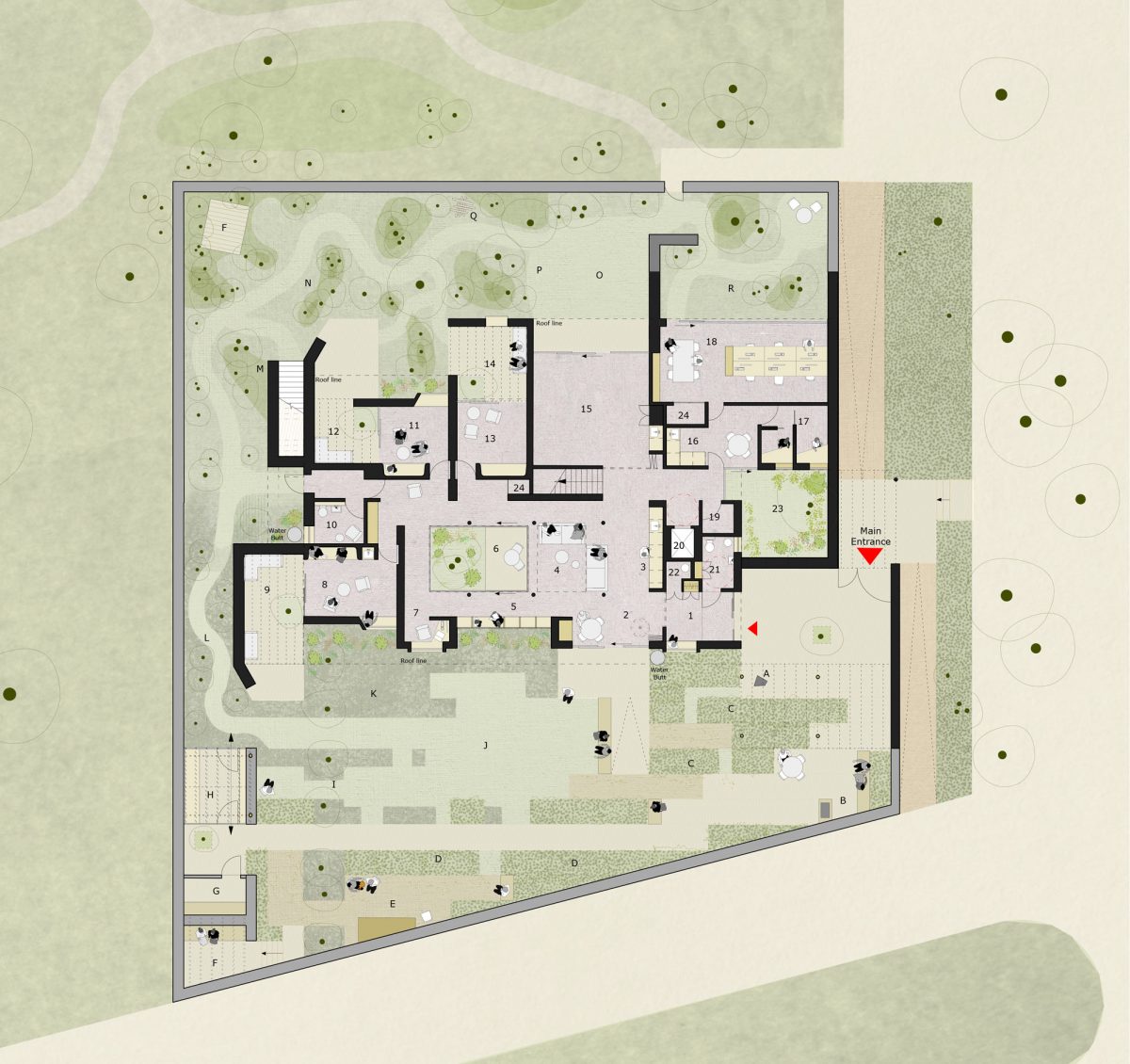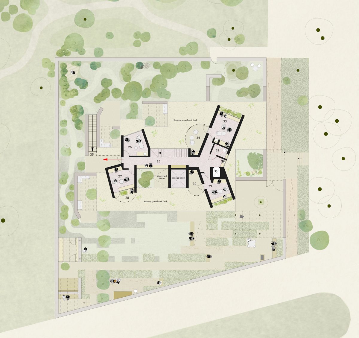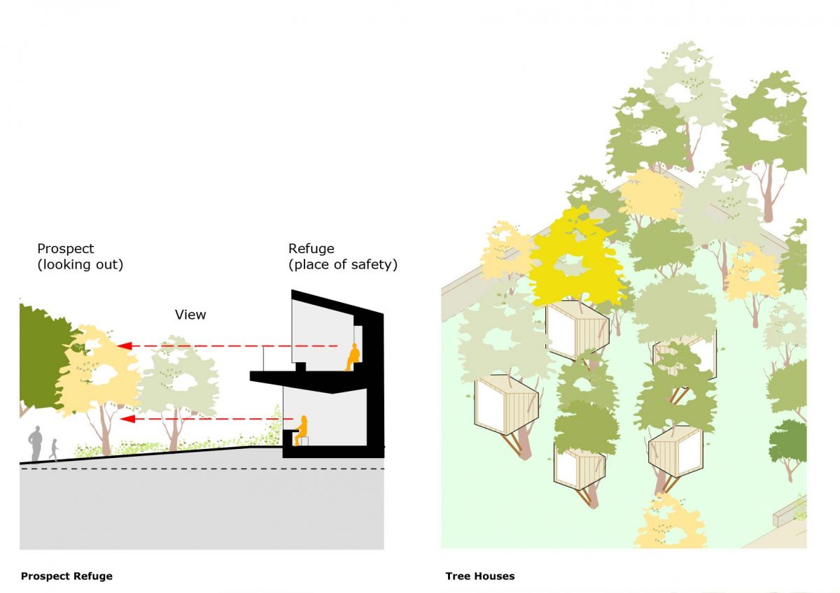 Our design focused on the provision of intimate spaces that support individual reflection, social activity, formal and informal counseling. These spaces, whether enabling or contemplative, will follow the comfort principles of ‘prospect and refuge’: spaces that provide people with the ability to see out to a clear view, from a safe vantage point without being seen. These spaces will be found both within and outside the building – linking landscape and architecture into a unified whole.