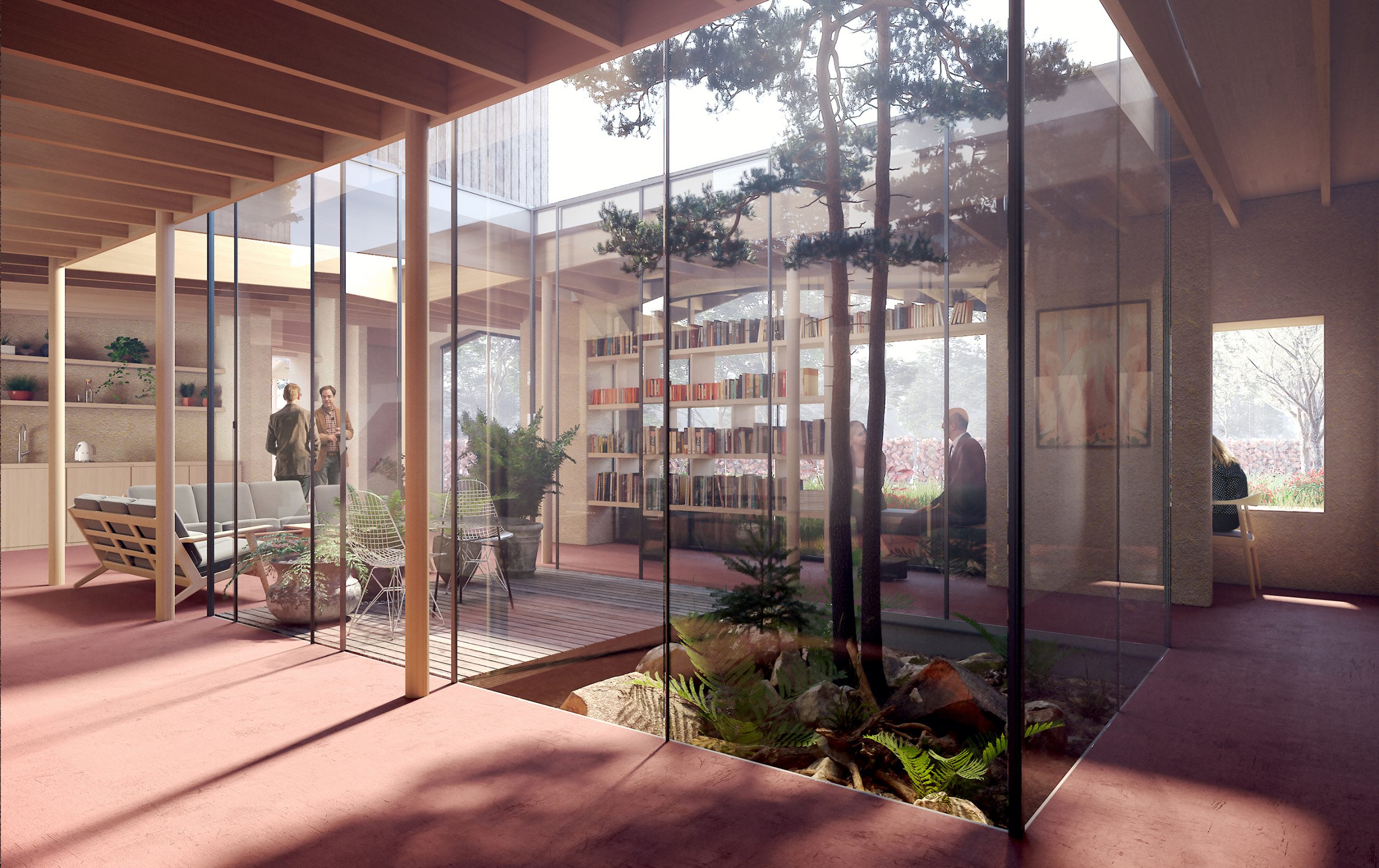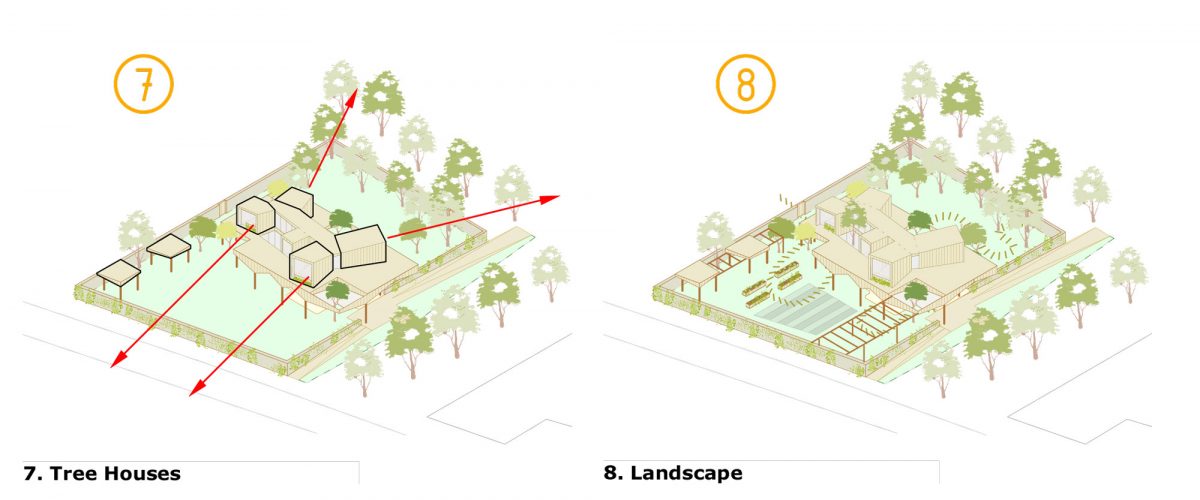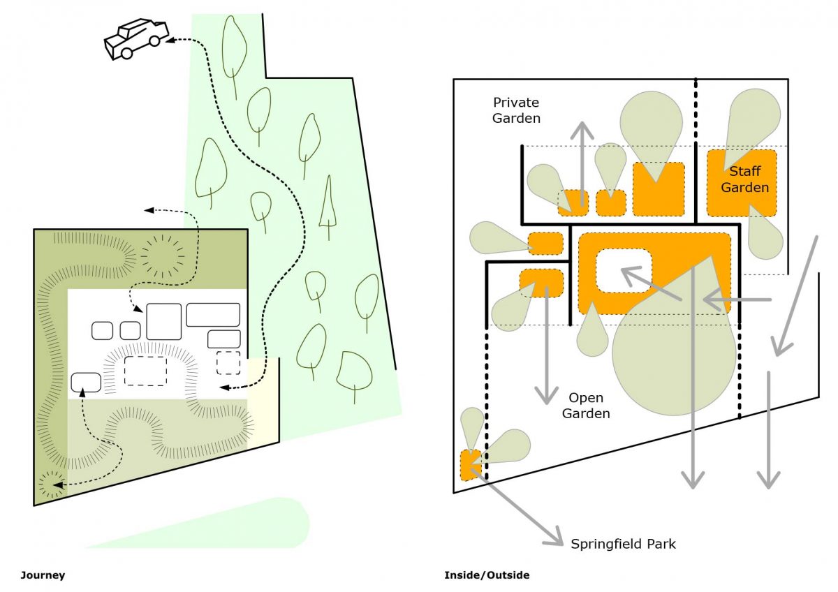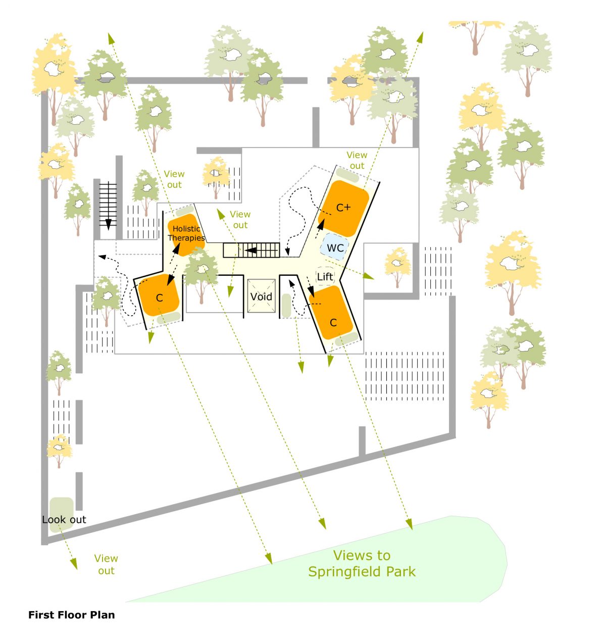Our design focused on the provision of intimate spaces that support individual reflection, social activity, formal and informal counseling. These spaces, whether enabling or contemplative, will follow the comfort principles of ‘prospect and refuge’: spaces that provide people with the ability to see out to a clear view, from a safe vantage point without being seen. These spaces will be found both within and outside the building – linking landscape and architecture into a unified whole.