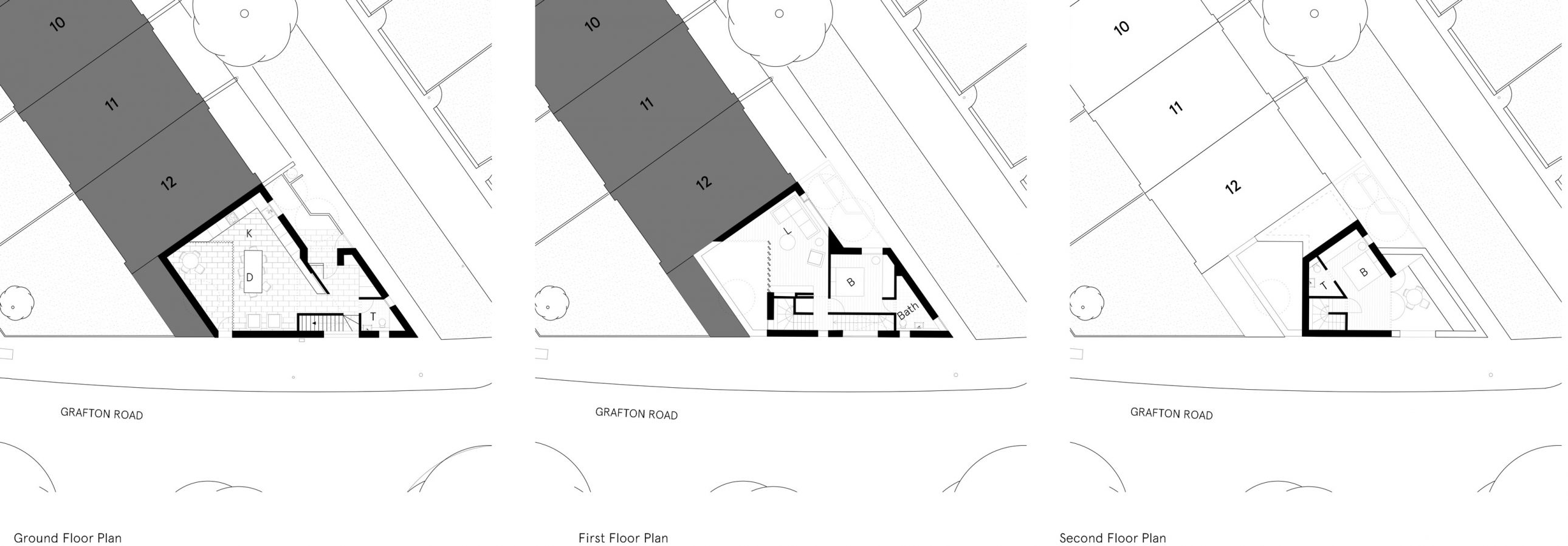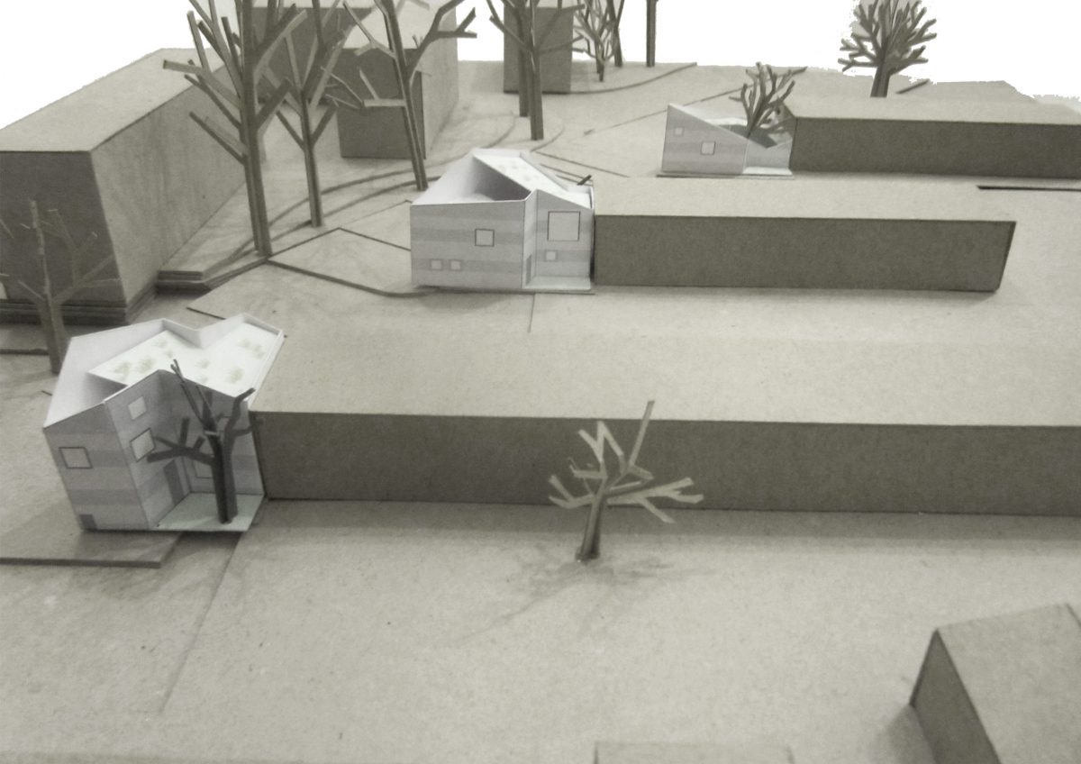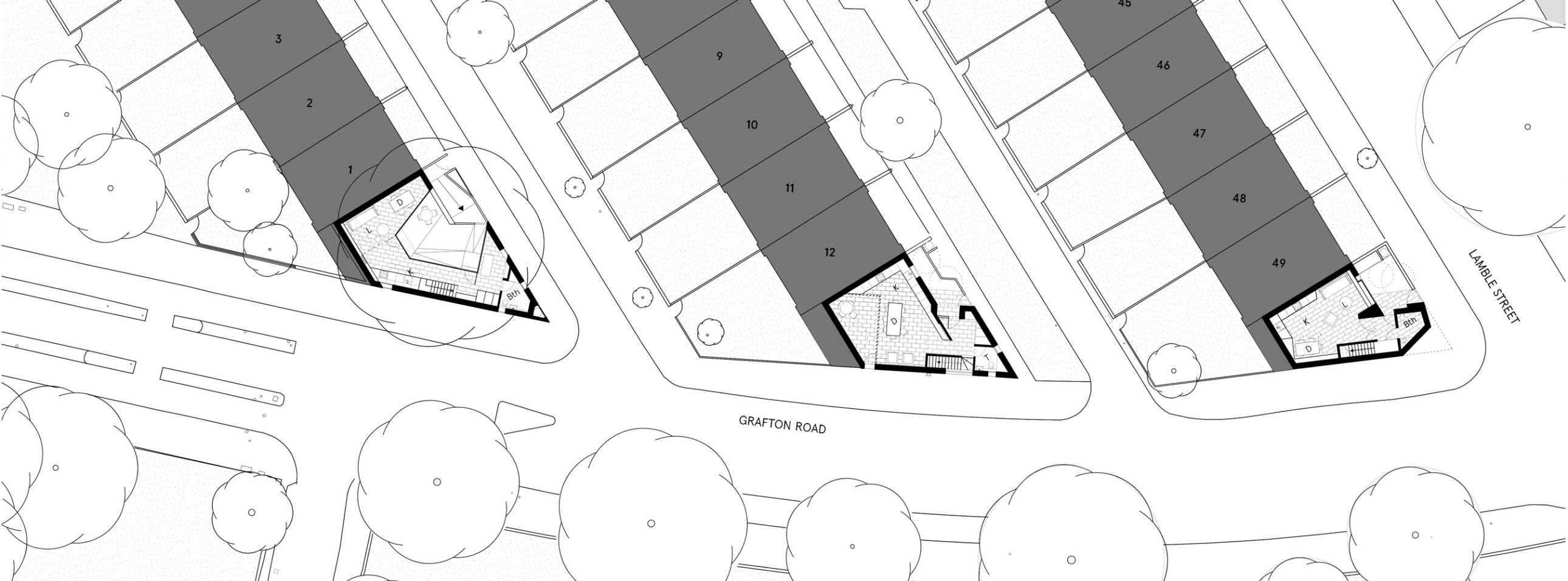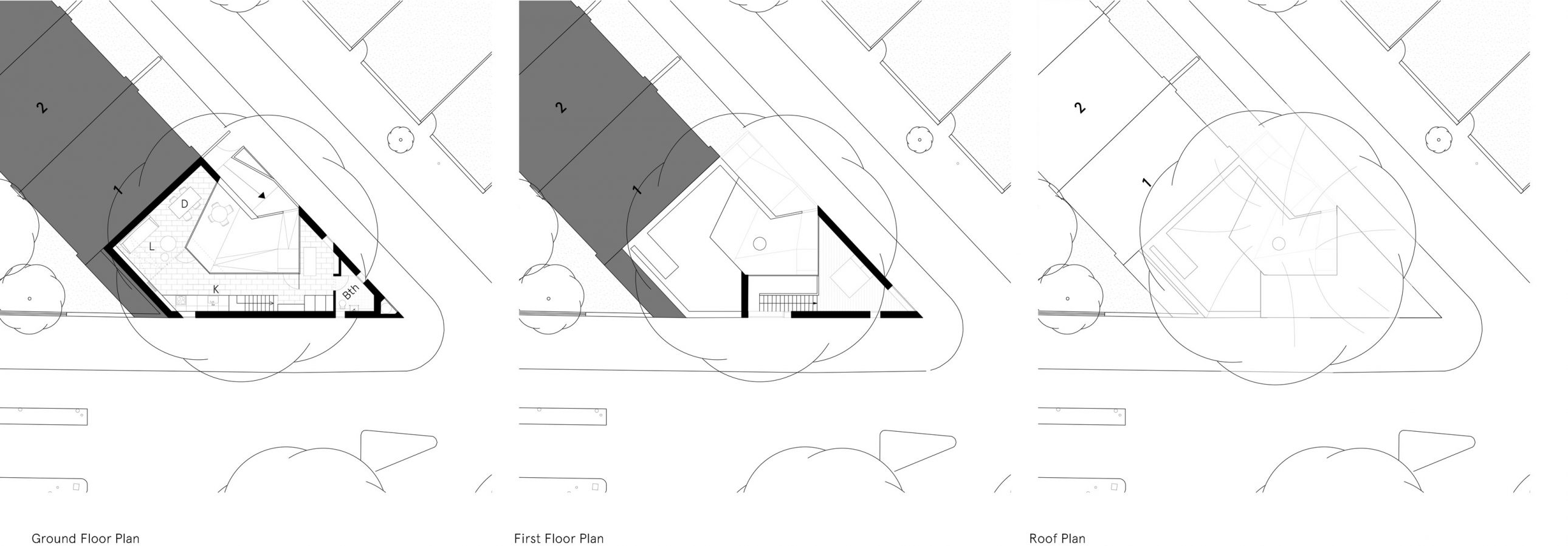 The design for each house responds to its small awkward-shaped plot with a sophisticated arrangement of set-backs, courtyard spaces, raked parapets and window configurations in order to overcome potential overlooking, to retain mature trees and to comply with statutory design standards including the provision of private amenity space.