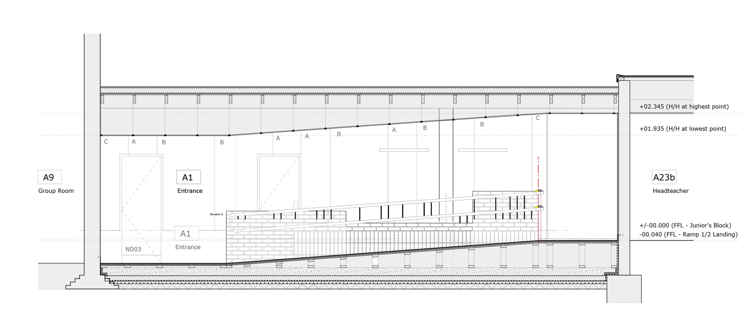 We were appointed to design a number of small building projects for the school that including the design of a new front entrance and display area to show off the work produced by the children. The design accommodates the difference in height between the two teaching blocks with the introduction of an accessible ramp on the edge of the new building with a brickwork island in the centre of the entrance.