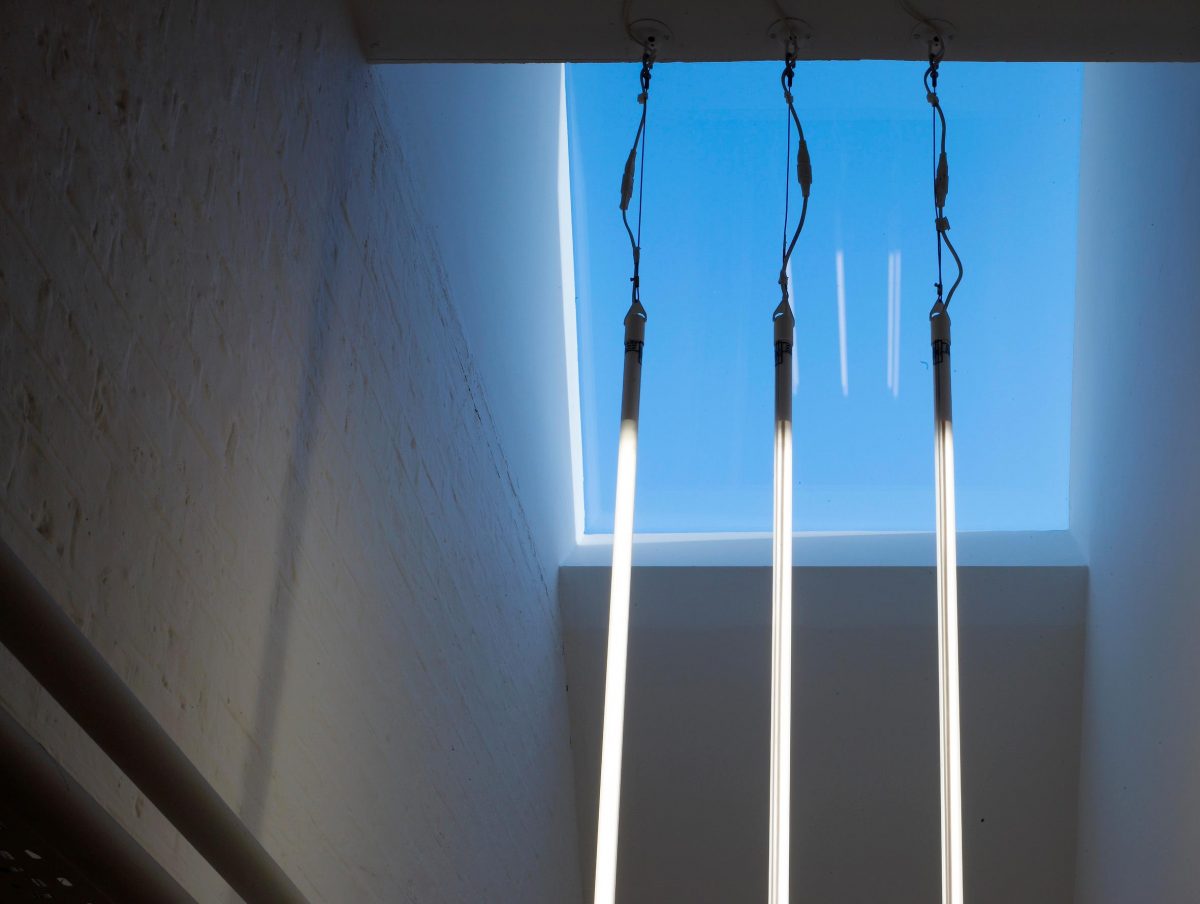 Our design for the school sought to maximise the impact of new skylights and provide new artificial lights to provide an airy and dynamic pupil foyer in the middle of the school. Small, slot-shaped skylights with deep shafts were used to get light into offices and large, simple shaped lights into circulation areas.